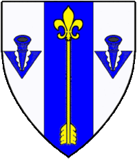[[File:EvrardDevice.gif|thumb|200px|left|Argent, on a pale between two pheons azure an arrow inverted headed of a fleur-de-lis Or.]] | |||