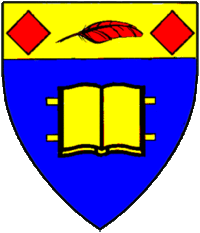 [[File:AlessandraDevice.gif|thumb|200px|right|Azure, an open book and on a chief Or a quill pen fesswise between two lozenges gules.]] | |||