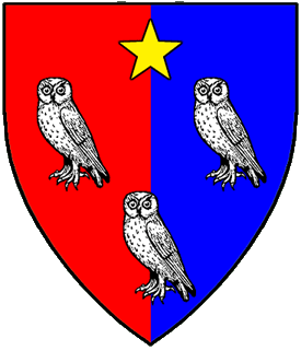 Per pale gules and azure, three owls argent and in chief a mullet Or.