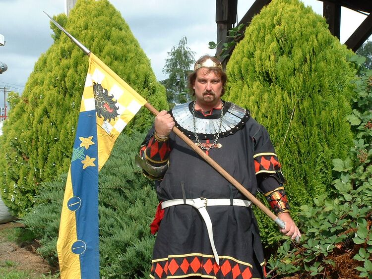 Baron Sir Aleksii at the Emprise of the Black Lion, September 2008. | [[File:Aleksii holding spear Emprise 2008.JPG|thumb|750px|left|Baron Sir Aleksii at the Emprise of the Black Lion, September 2008.]] | ||