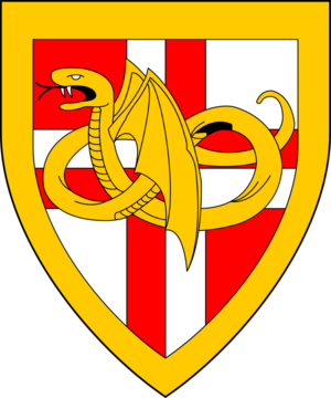[[ | [[File:JosefdeGonnevilleDevice.png|thumb|300px|left|Quarterly gules and argent, a cross counterchanged overall a pithon nowed erect wings addorsed within a bordure Or.]] | ||