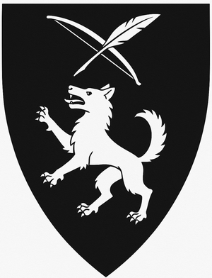 Blazon: Sable, a wolf rampant contourny argent, in chief a quill and a bow in saltire argent.