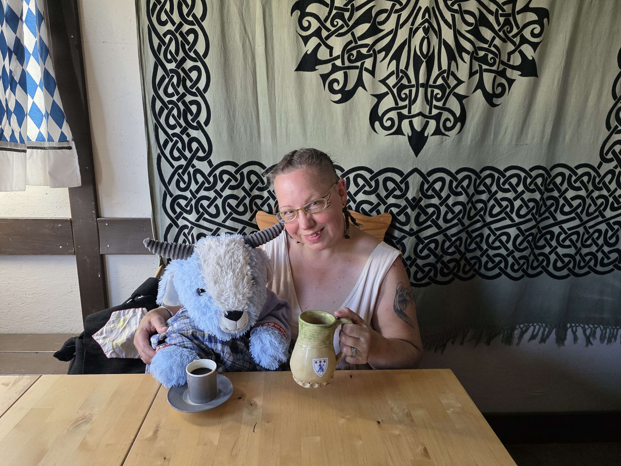 Bartholomew and Sadhbh Bheag inghean Toirrdhealbhaigh sharing a drink at Quad War in Avacal, 2025.