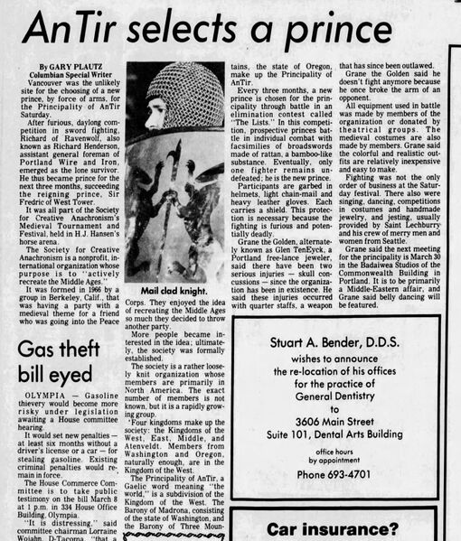 Newspaper report of the 2nd Coronet Tourney for An Tir. The Columbian (Vancouver, Washington) Sunday, March 3, 1974.