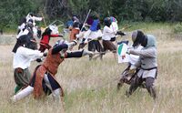 Lions War is a war hosted by the Barony of Lions Gate on the August Long Weekend in Clinton, BC, originally the site of Clinton War of which this event superseded. Well known for the hot days, cold nights and the infamous Clinton dust, the war features war scenarios for armoured combat, rapier and cut & thrust, with archery, thrown and if available equestrian activities. Bardic, arts and sciences, largesse competitions and games like tablero and spear the beer are also found as you wander the site.