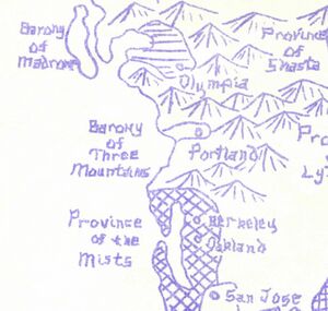 As you can see from this early (1971) map, the Barony of Three Mountains was Oregon, centered in Portland, and the Barony of Madrone was Washington, centered in Olympia.