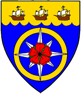 Azure, on a compass rose Or a rose gules and on a chief invected Or three ships proper sailed argent