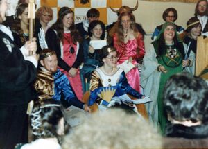 Following (and sometimes during) which, the banquet proceeded, for indeed the food was ready and the populace nigh starved. After four removes they deemed survival possible, nay, even pleasant. Entertainers included the Seagirt Guisers, who presented a play: "My Lady Faire"; Roger the Goliard and Arias the Innkeeper's Daughter sang both sweet and bawdy songs, and the evening ended with revelry and cleanup. Borealis was given a handmade bowl by Thomas of Appledore, and was especially grateful to the good folk of Lions Gate for their provision of submarines crashspace. No citizens were reported drowned on their way home.