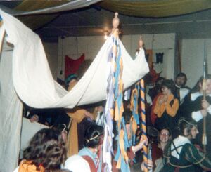 Among the honored guests were Their Majesties of the West, Frederick and Nicorlyn; they presented to William of Woodland the Order of the Pelican, and to Roberta of Rowan the Order of the Laurel. (This court was held immediately after the coronation and first court of Scellanus and Maelen, of which more follows). Baron Gerhard and others presented to His Majesty a petition entreating that An Tir be made a kingdom; this petition was accepted and His Majesty pledged his support.