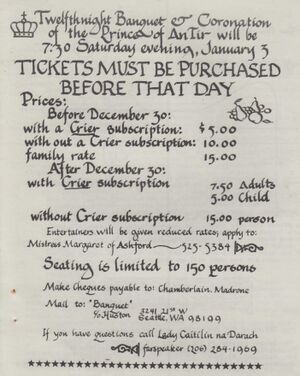 The Twelfth Night Revel and Coronation of the Prince and Princess of An Tir was held at the Knights of Columbus Hall on 91st Ave. N. E., Seattle, Washing­ton, January 3, A. S. X.