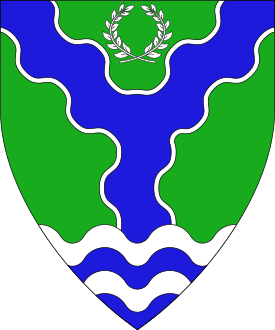 ![]() Vert, a pall wavy azure fimbriated and in chief a laurel wreath argent, a ford proper. | ||||||