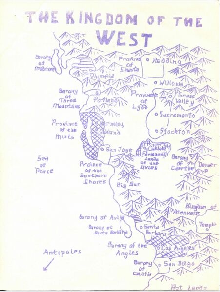 Earliest known map of the Kingdom of the West that includes the baronies of Three Mountains and Madrone in what would become An Tir. From the April 1971 Lydd newsletter.