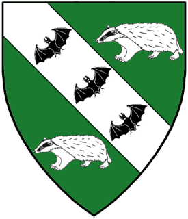 Heraldry of Aline Swynbroke. Vert, on a bend argent between two badgers statant argent marked three reremice sable.