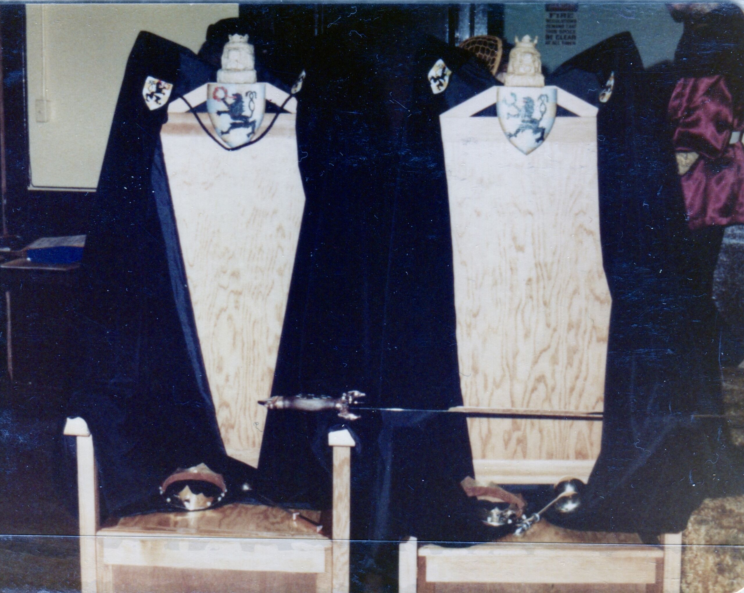 First thrones and cloaks of An Tir. An Tir 12th Night, January 16, 1982. An Tir becomes a kingdom. Manfred and Morag are crowned King and Queen. From the Hroswitha & Knut collection, Scanning An Tir Project.