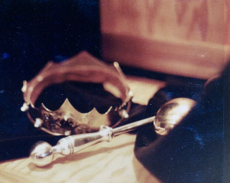An Tir First Crown, Orb, and scepter. An Tir 12th Night, January 16, 1982. An Tir becomes a kingdom. Manfred and Morag are crowned King and Queen. From the Hroswitha & Knut collection, Scanning An Tir Project.