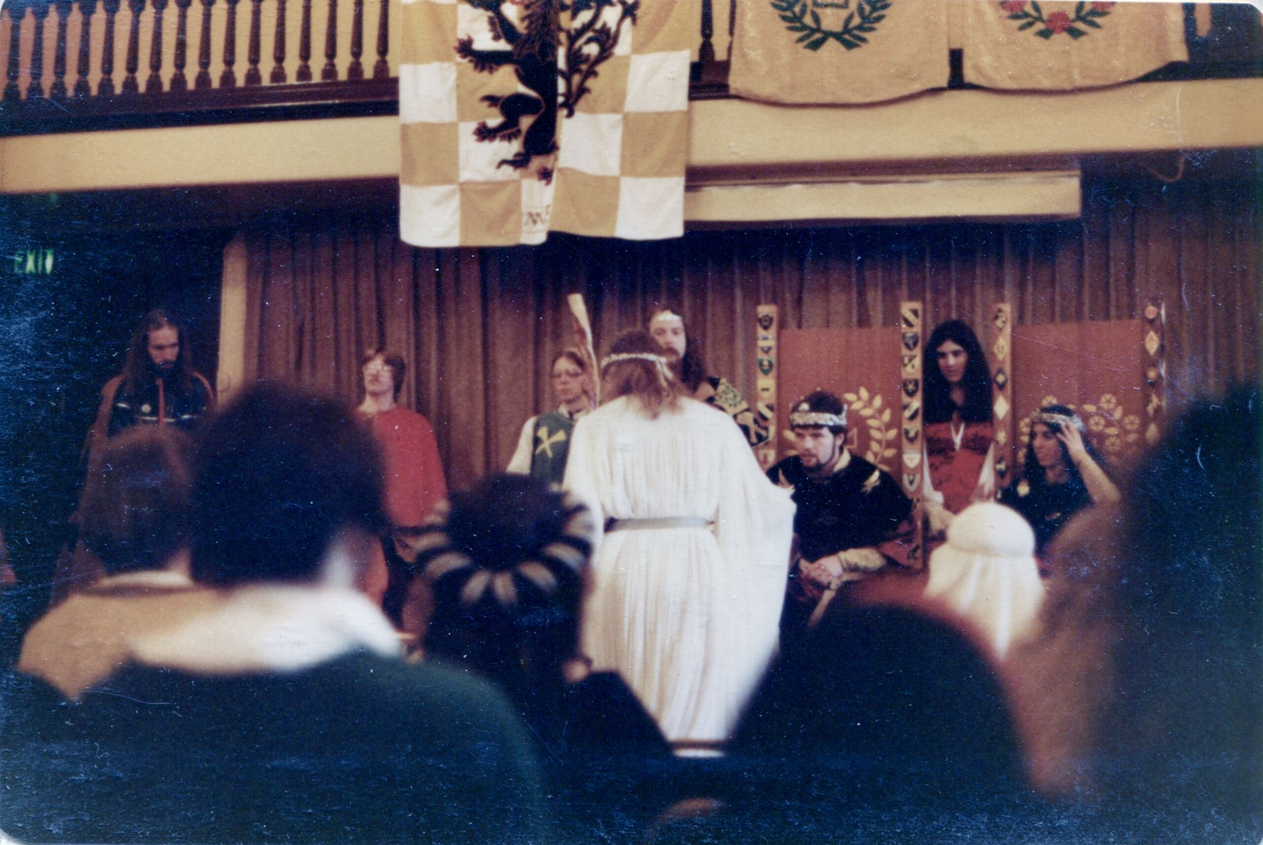 An Tir 12th Night, January 16, 1982. An Tir becomes a kingdom. Manfred and Morag are crowned King and Queen. From the Hroswitha & Knut collection, Scanning An Tir Project.