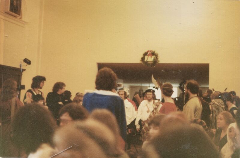 An Tir 12th Night, January 16, 1982. An Tir becomes a kingdom. Manfred and Morag are crowned King and Queen. From the Hroswitha & Knut collection, Scanning An Tir Project.