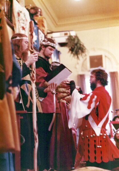 An Tir 12th Night, January 16, 1982. An Tir becomes a kingdom. Manfred and Morag are crowned King and Queen. Courtesy of the Lee of the Lowlands collection, Scanning An Tir Project.