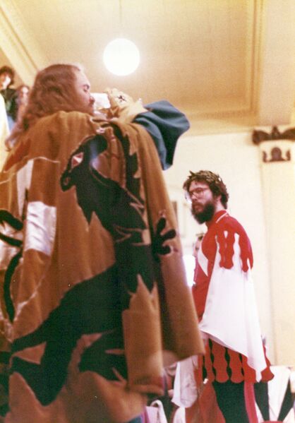 An Tir 12th Night, January 16, 1982. An Tir becomes a kingdom. Manfred and Morag are crowned King and Queen. Courtesy of the Lee of the Lowlands collection, Scanning An Tir Project.