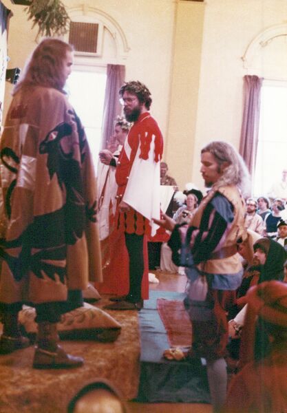 | current | 12:14, 5 June 2025 | 2,038 × 2,932 (5.49 MB) | SirRichard (talk | contribs) | An Tir 12th Night, January 16, 1982. An Tir becomes a kingdom. Manfred and Morag are crowned King and Queen. Courtesy of the Lee of the Lowlands collection, Scanning An Tir Project. |