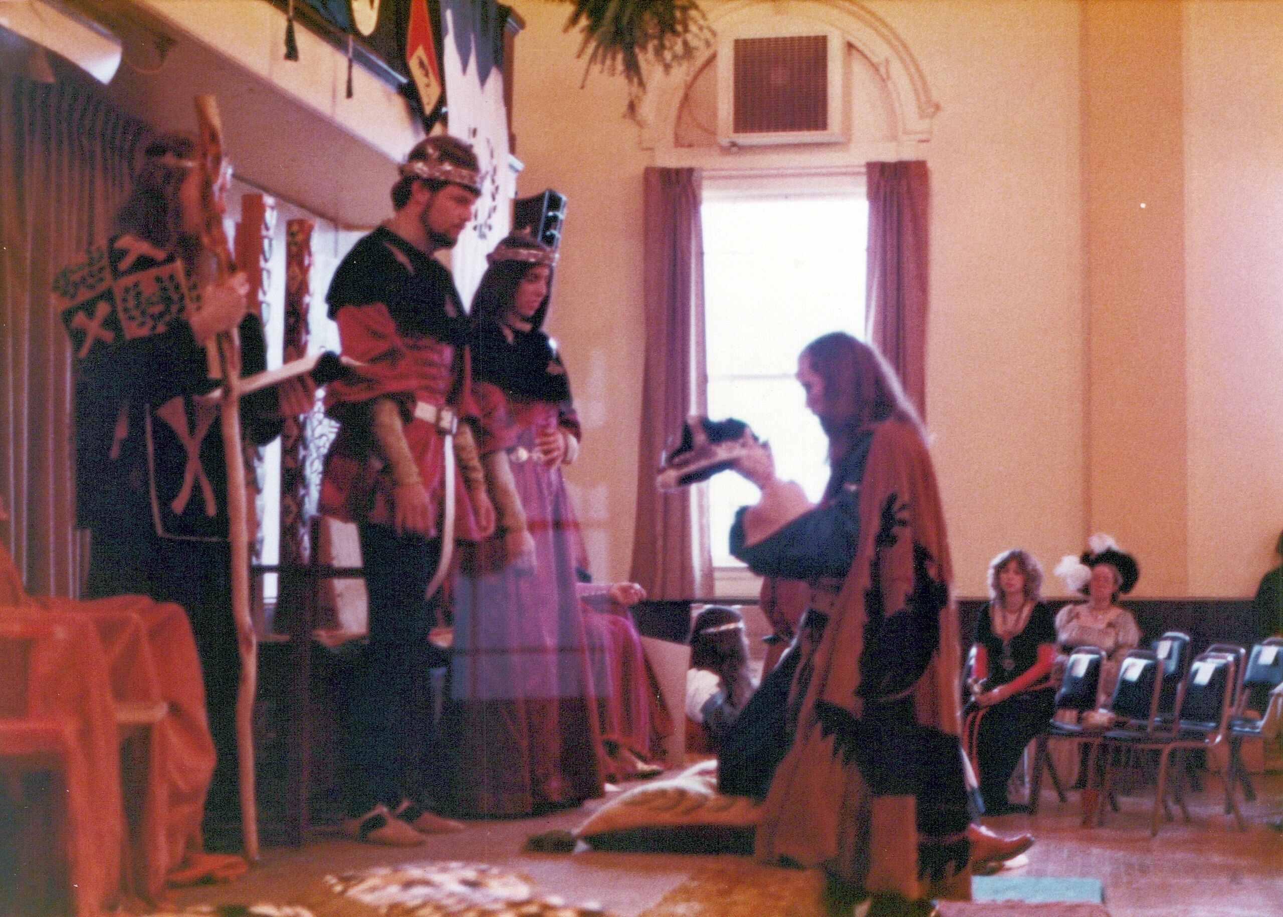 An Tir 12th Night, January 16, 1982. An Tir becomes a kingdom. Manfred and Morag are crowned King and Queen. Courtesy of the Lee of the Lowlands collection, Scanning An Tir Project.