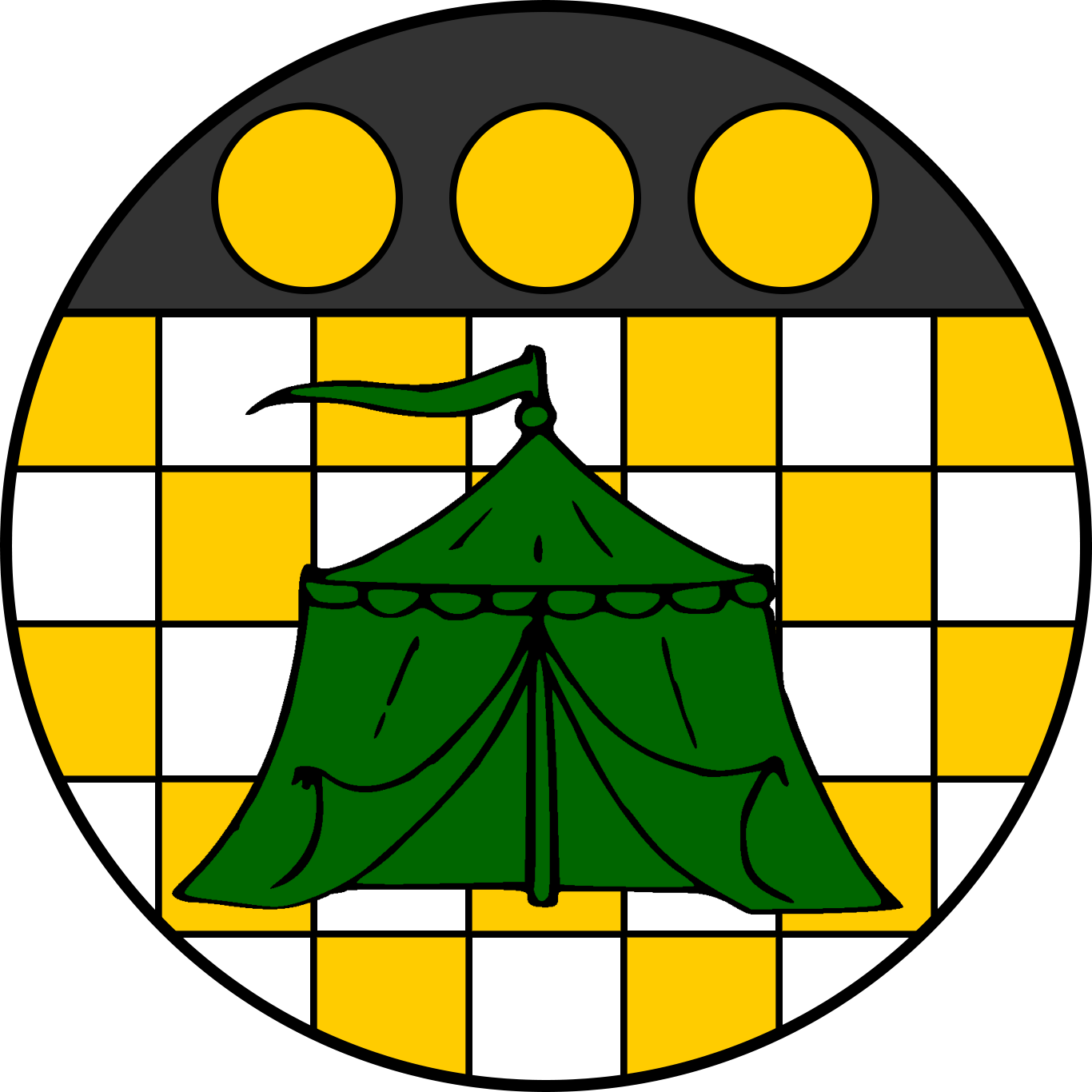 adge for the Honor of the Good Booth, round version. Checky Or and argent, a pavilion vert and on a chief sable three bezants. From https://herald.poore-house.com/wp-content/uploads/AnTirGoodBoothR.png, by Cormac Mor.