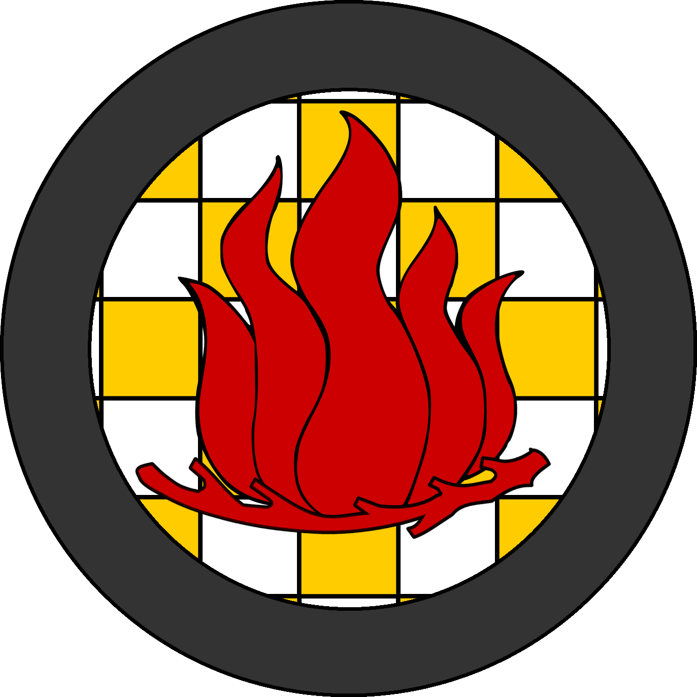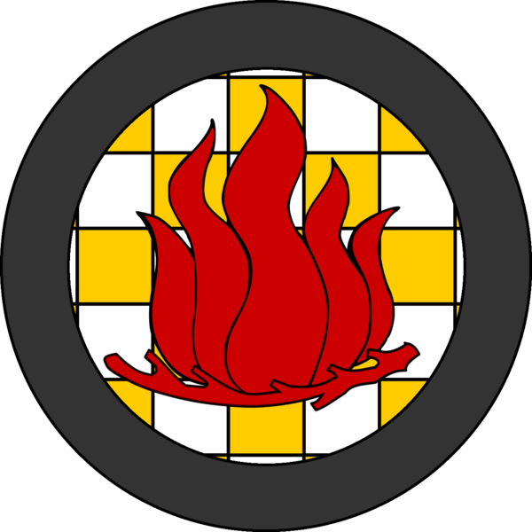 Hearth of Hospitality badge, round version - Checky Or and argent, a flame maintaining in base a branch fesswise gules, a bordure sable.
