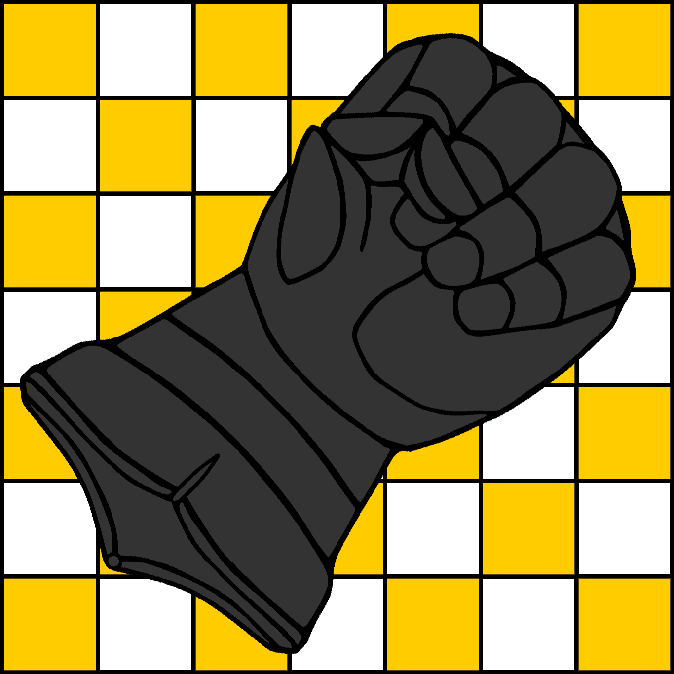 Badge for the Order of the Sable Gauntlet, square version. Checky Or and argent, a gauntlet clenched bendwise sinister sable.