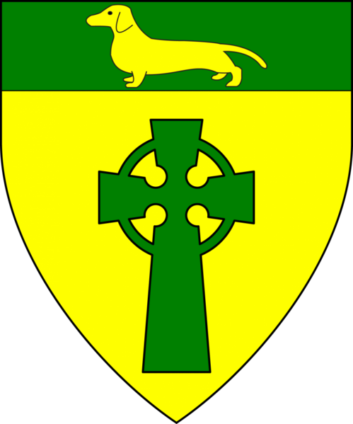 Heraldry of Anne of BearsHaven. Or a Celtic cross and on a chief vert a badgerhound statant Or.