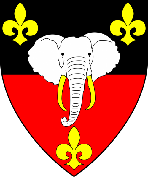 Heraldy of Aisha al Zahra. Per fess sable and gules, an elephant's head cabossed argent armed between three fleur-de-lis Or.