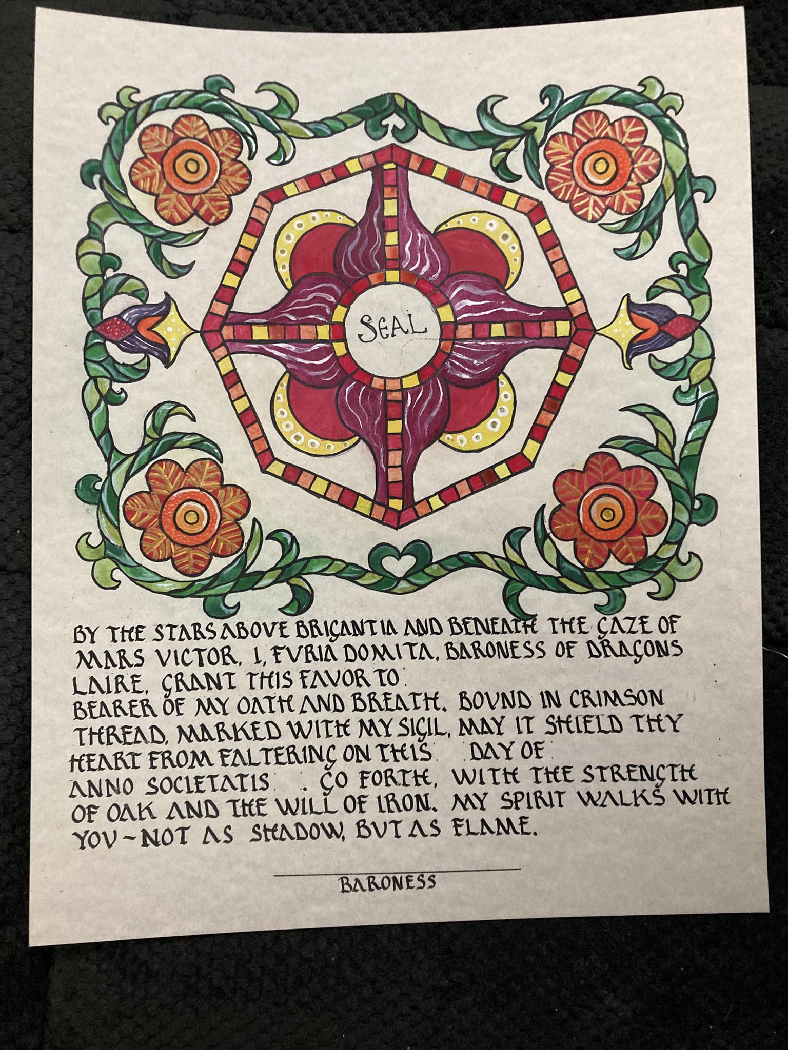 By the stars above Brigantia and beneath the gaze of Mars Victor, I, Furia Domita, Baroness of the Dragon’s Laire, grant this favor to __________, bearer of my oath and breath. Bound in crimson thread, marked with my sigil, may it shield thy heart from fear, thy blade from faltering on this ___ Day of ________ Anno Societatis __________ . Go forth, with the strength of oak and the will of iron.My spirit walks with you — not as shadow, but as flame.