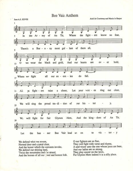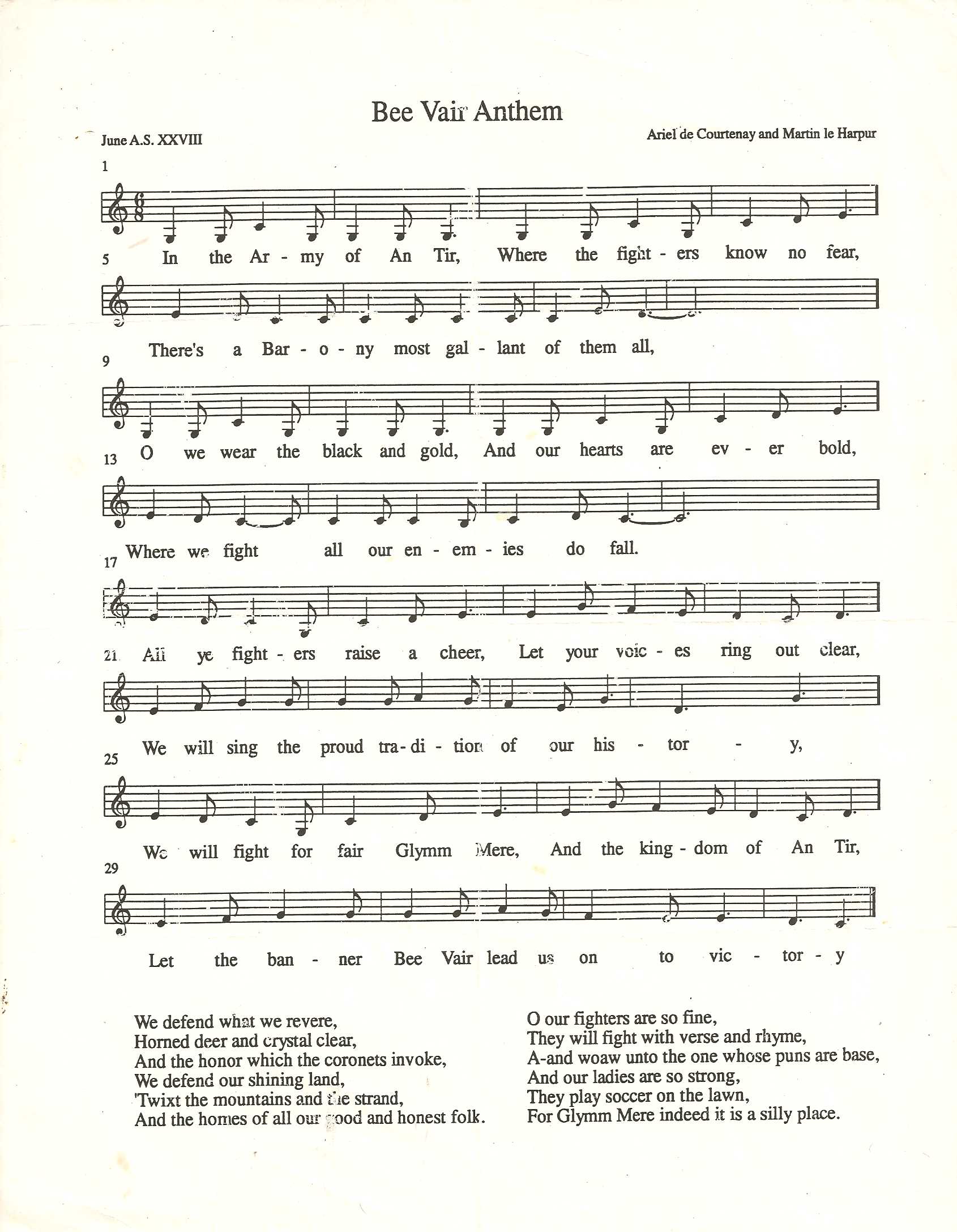 The Bee Vairian Anthem musical score. Written by Ariel de Courtenay and Martin le Harpur. June 1994.