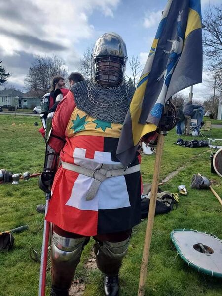 Sir Richard Fitzalan, one of the founders of the Beevairian Company, acting as a Beevairian still in 2024, on the war field holding the Baronial Beevairian Banner that he, as Founding Baron Glymm Mere, presented to the Company more than 30 years before.