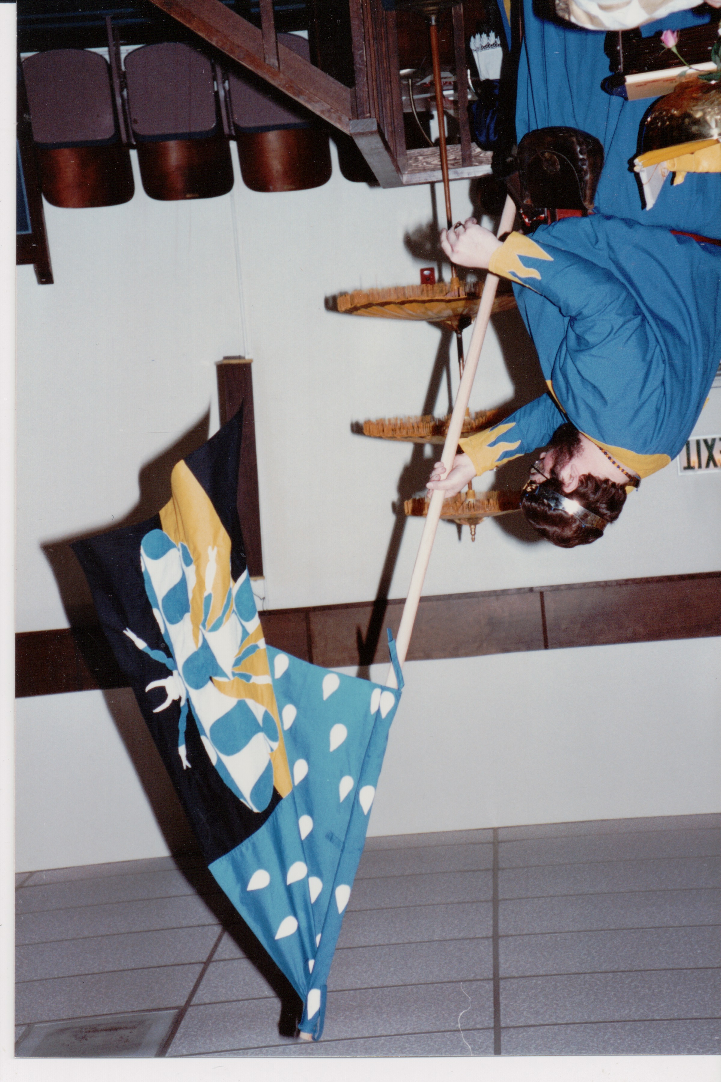 Baron Richard Fergus Fitzalan displaying the new Beevairian baronial banner during first court, February 1993.