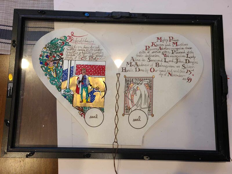 Silver Hands award in a cordiform shape, gilded, painted and calligraphed, archery themes.