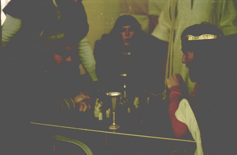 Steingrim and Edward playing chess while Fiona watches at the An Tir Coronation 16 April 1977. Photo Courtesy of Theodulf of Borogrove.
