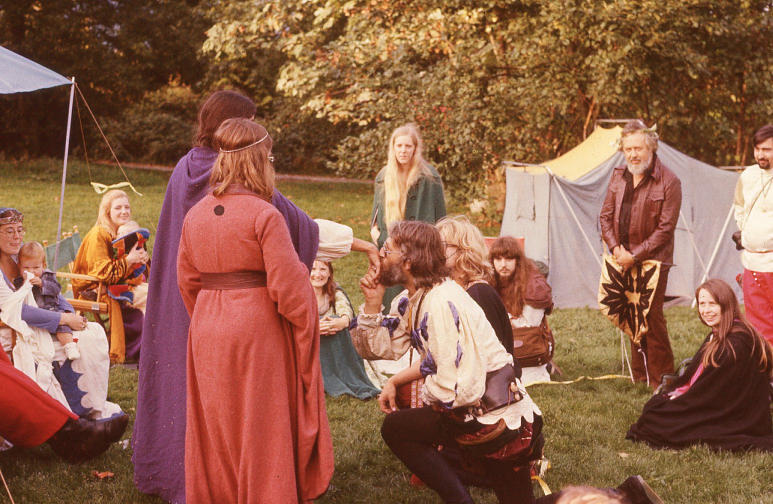 Michel le Voyageur (white jersey & red pants) and Susan the Opaque (on the ground with a black cloak). Coronet Tourney 10, October 1976. Photo Courtesy of Theodulf of Borogrove.