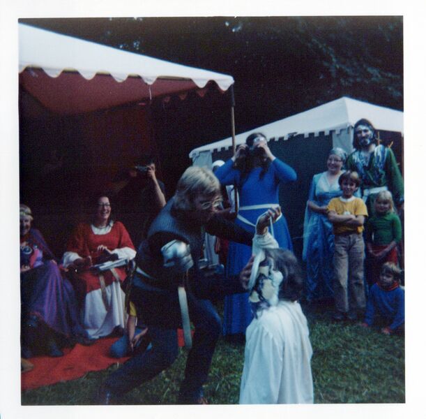 | current | 21:08, 27 November 2025 | 2,063 × 2,025 (3.12 MB) | SirRichard (talk | contribs) | Prince Steingrim delivering the pie at fund-raising auction to Gerhard Kendal at the 15th Coronet Tourney, July 1978. From Scanning An Tir, Rowena de Manning Collection. |