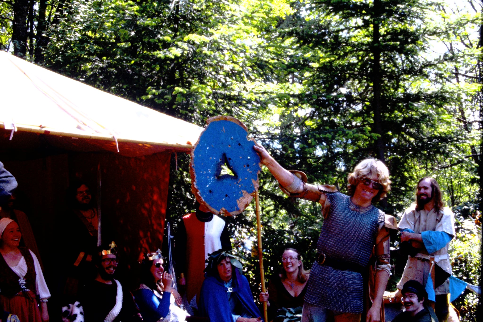 This photo was taken at Coronet Tourney May 12-13, 1979 at Camano Island State Park. Torgul is being awarded the Shattered Shield. Manfred and Koressa are P&P of An Tir. Trelon and Tamsin, as the new heirs, are sitting off to the side with wreaths on their heads. Sir Seamus Peacemaker is standing on the right. Photo courtesy of Rowena de Manning.