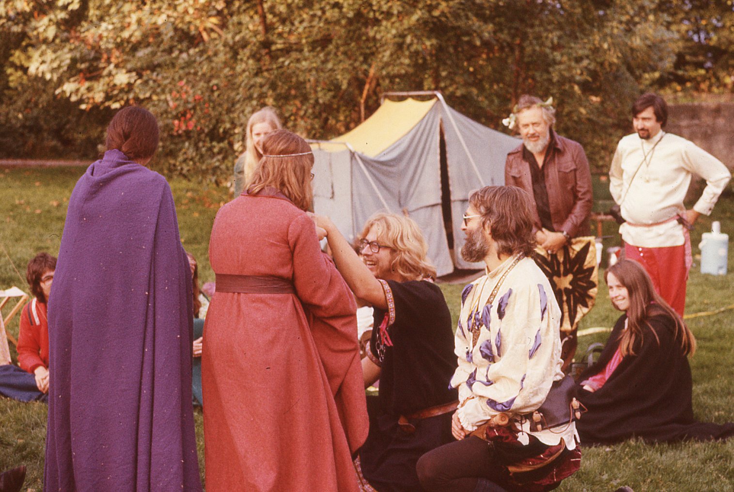 Michel le Voyageur (white jersey & red pants) and Susan the Opaque (on the ground with a black cloak). Coronet Tourney 10, October 1976. Photo Courtesy of Theodulf of Borogrove.