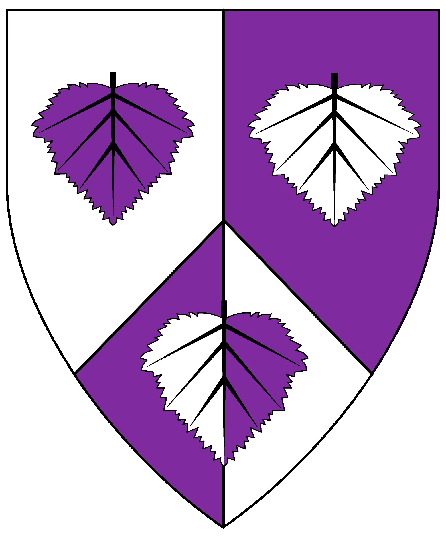Per pale and per chevron argent and purpure, three birch leaves inverted counterchanged.