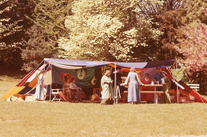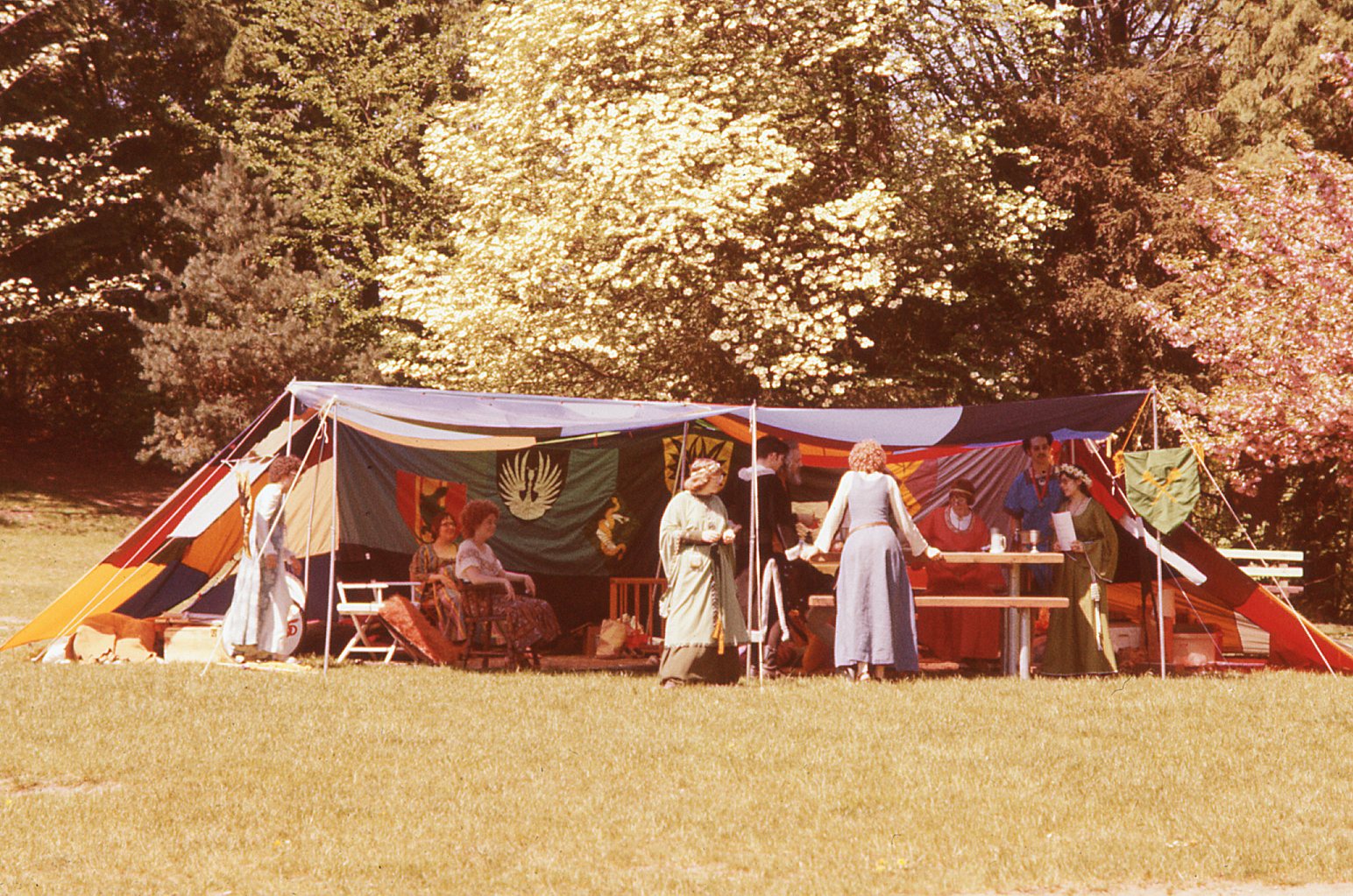 Michael & Stevanna’s pavilion at the Saint Edwin’s Day Tourney and Beltaine in Madrone on May 1, 1976.