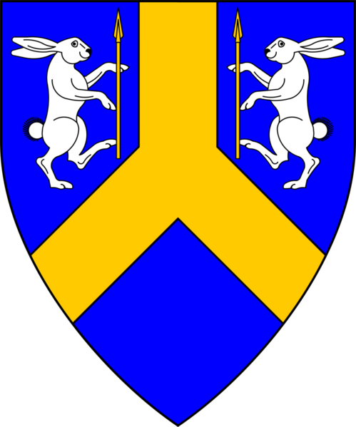 Heraldry of Dame Elizabeth FittzWilliam of Carlisle. Azure, a pall inverted Or between two hares combattant argent each maintaining a spear Or.