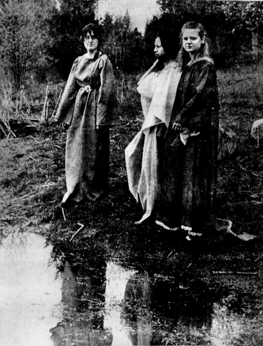 “MAID CYNTHIA, MAID MARQUET AND DAME SHEEN OF IRE AT LEISURE. Oft Called Donna Schumann, Mary Johns And Cheryl Schumann.” First Tourney May 3, 1970, hosted by the Barony of Madrone in Olympia on Johnson Point Road. From The Olympian, May 10, 1970, Page 1.
