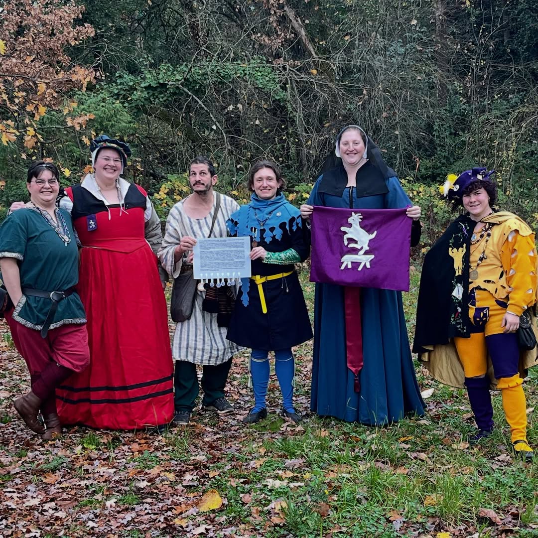 The Compagnie de Cabril at the signing of the household charter. L to R: Haeloc of Three Mountains, Helena Licht von Tübingen, Levi ben Daniel, Edmund Courtecuisse, Anne Southworth, Leo Phelan.