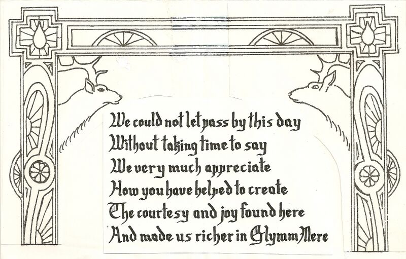 | current | 15:18, 25 November 2025 | 1,692 × 1,080 (663 KB) | SirRichard (talk | contribs) | Thank you card from Baron Richard and Baroness Gwendolyn Fitzalan as Baron and Baroness of Glymm Mere from 1993-1995. Interior frame of Crystal raindrops and Red Deer honor the Shire and Barony’s awards of the Crystal and the Red Deer (now Red Hart). Art by HL Vaclav Bili. Thank you poem written and calligraphed by Baron Richard Fitzalan. |