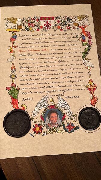 Gigi’s elevation scroll. Calligraphy, linework, painting (except the portrait, done by Baroness Maricka), wording, and translation (with assistance from Federico Marangoni) by Gracia.