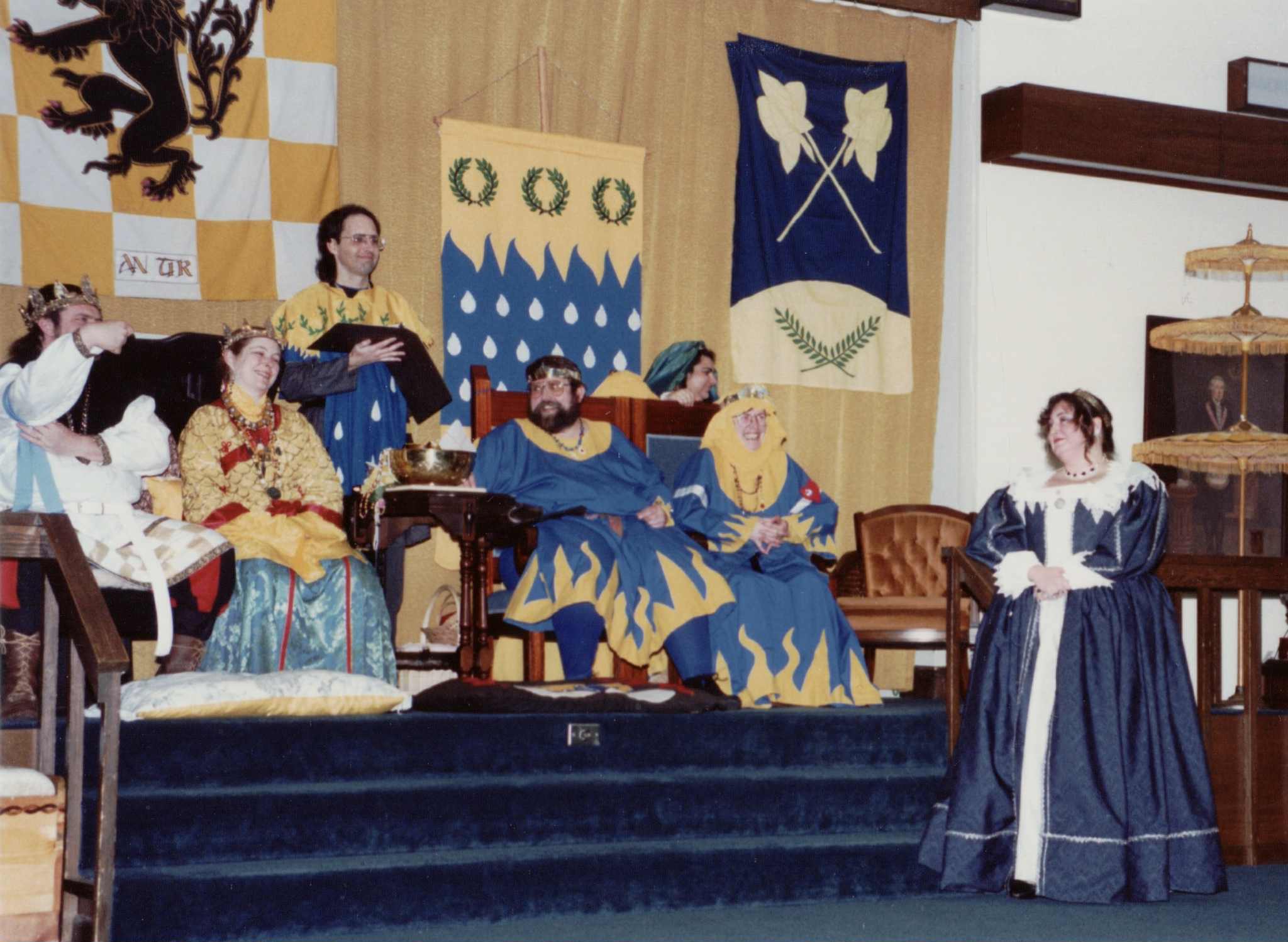 Their Majesties Barak and Yao attend Glymm Mere's first baronial court (Feb, 1993), hosted by Sir Richard Fergus Fitzalan and Baroness Gwendolyn Fitzalan. Baroness Isabeau de Lis Noir of Blatha an Oir attended as well. (This is an uncropped version of Sir Richard's file Glymmere1stcourt.jpg)
