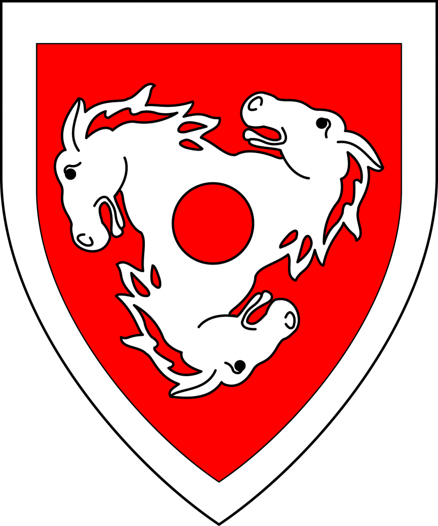 Heraldry of Baron Hengist Helgason. Gules, on a triskelion of horses' heads argent a torteau, a bordure argent.
