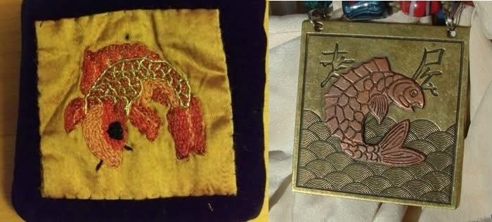 Embroidered token and medallion for the Honor of the Carp. On the left is the original by Dutchess Lao given to HL Tanko. On the right is a metal plaque based on the original, given to Mistress Meresigha.